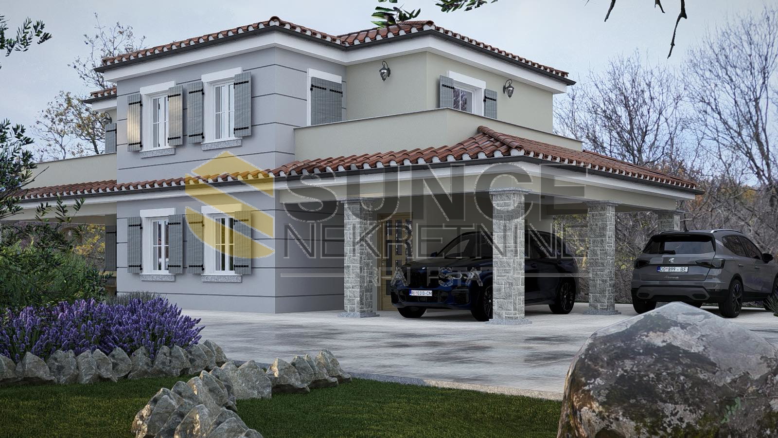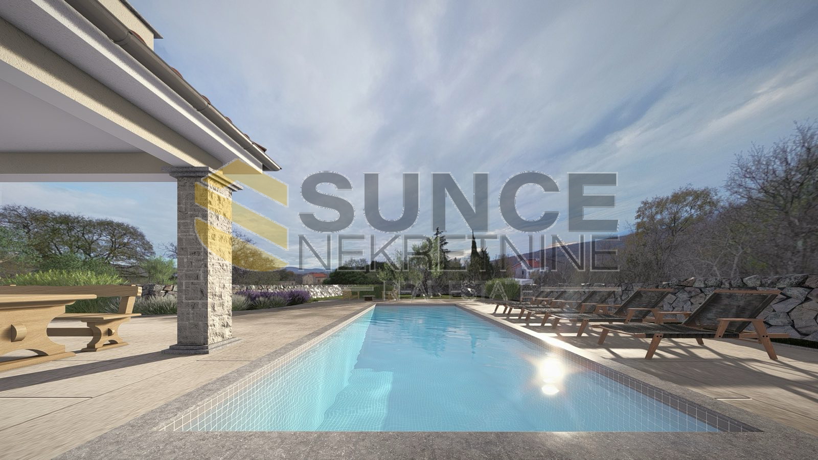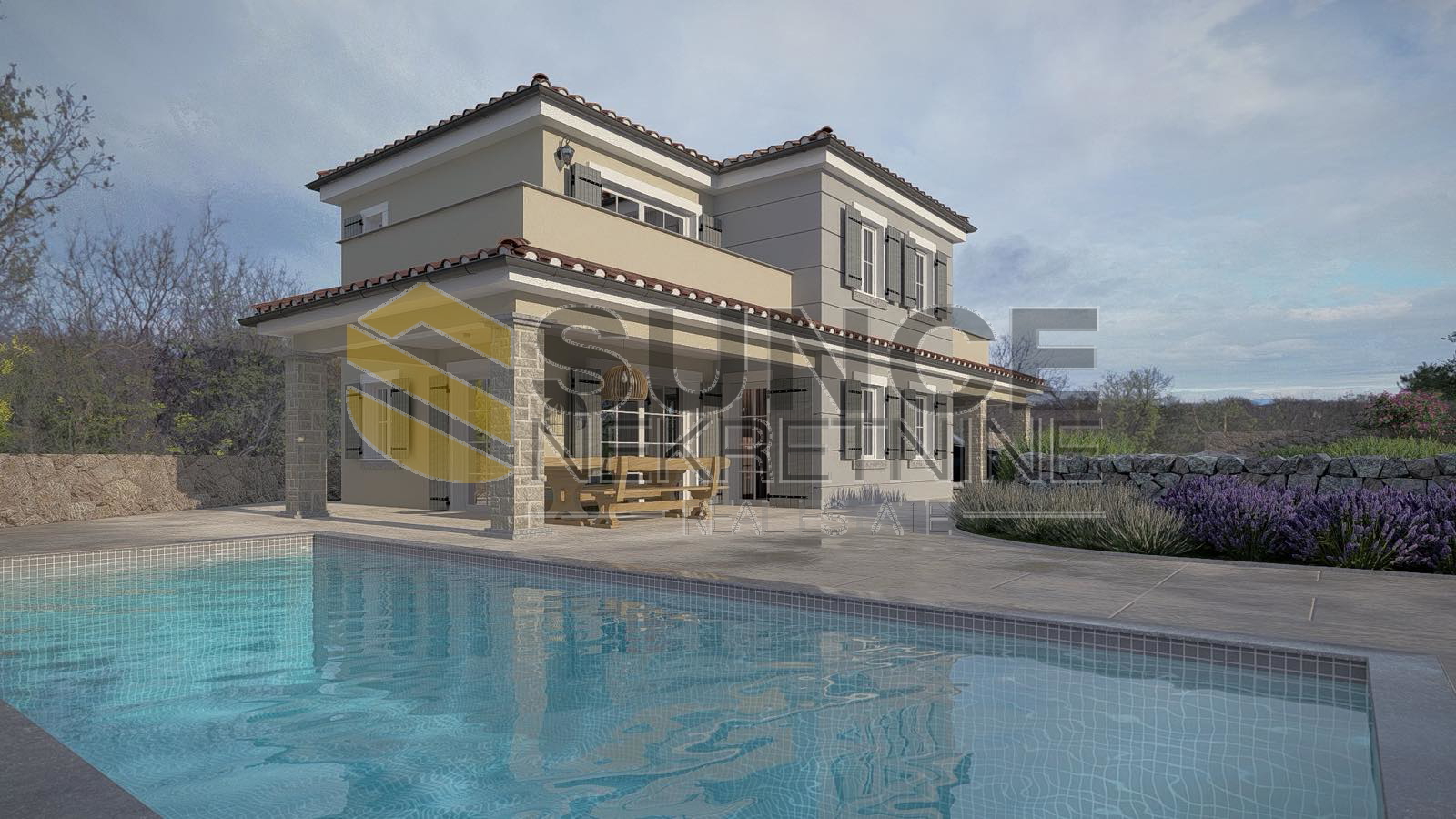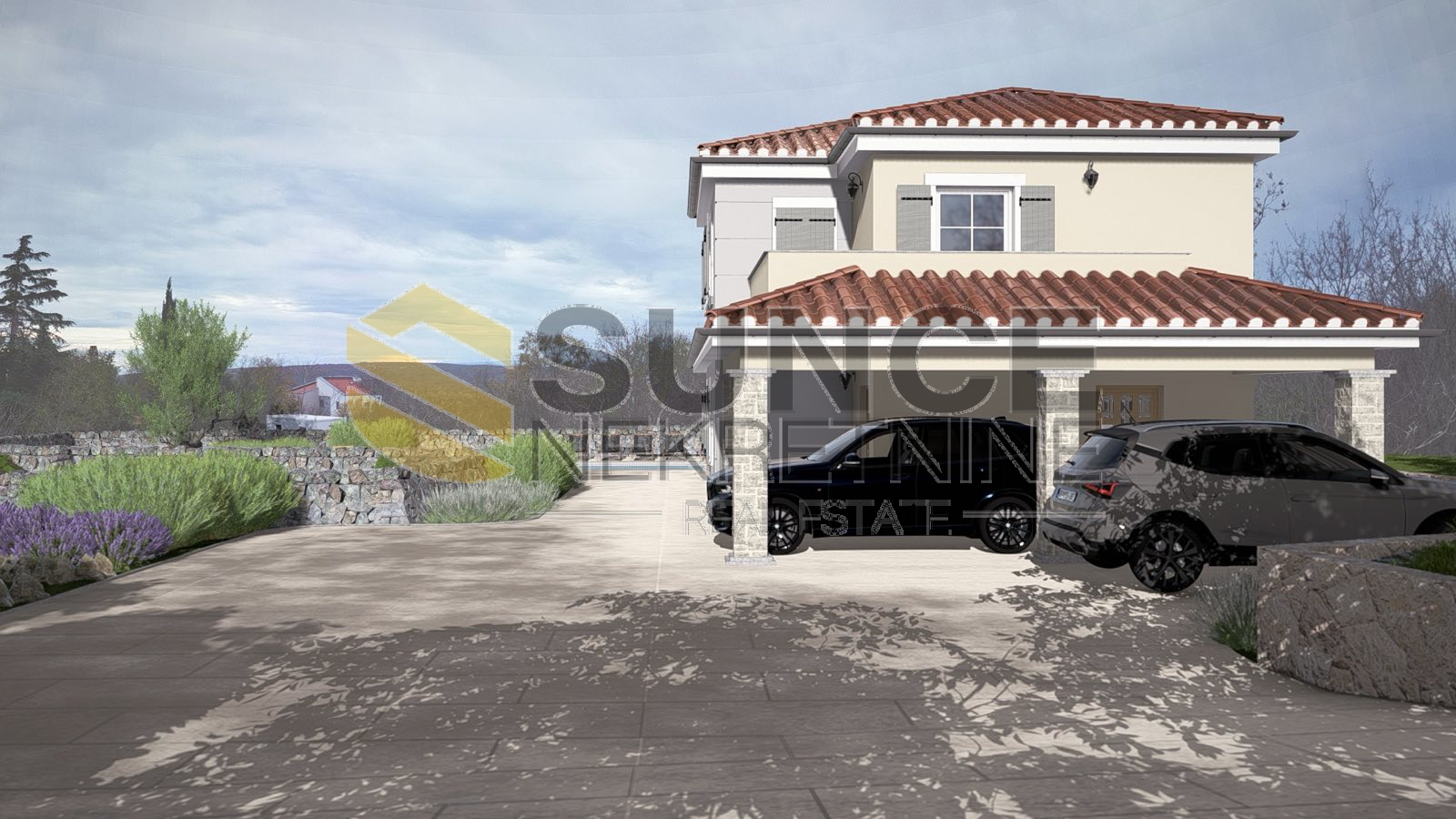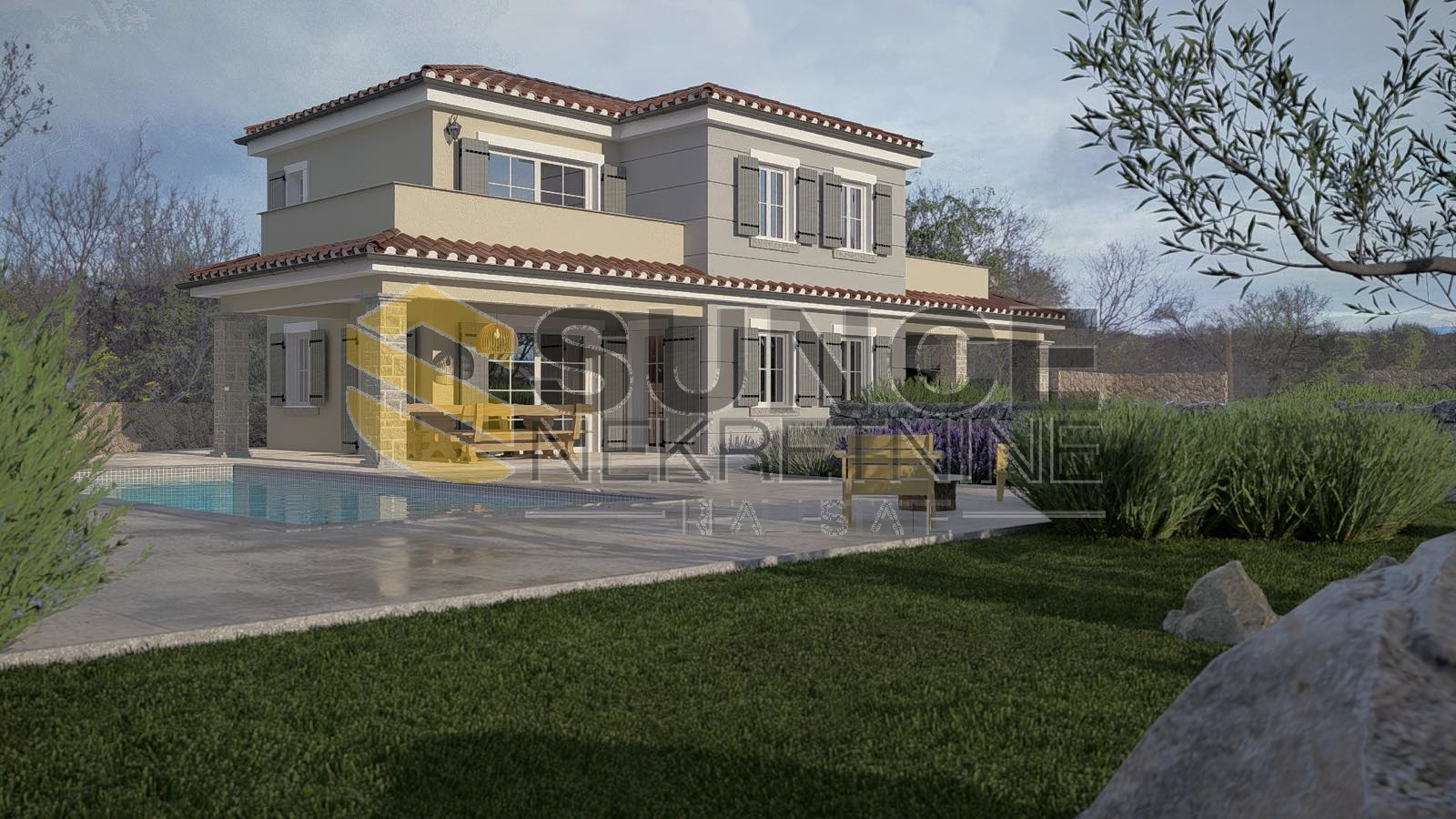 Island of Krk, Garica, building land for the construction of a detached house, ground floor + first floor, total area 160m2, consists of a ground floor with a kitchen with a living room, dining room, toilet, covered terrace and an upper floor with three bedrooms, each with its own bathroom, a swimming pool is planned on the plot. The location is quiet, on the edge of the construction zone.